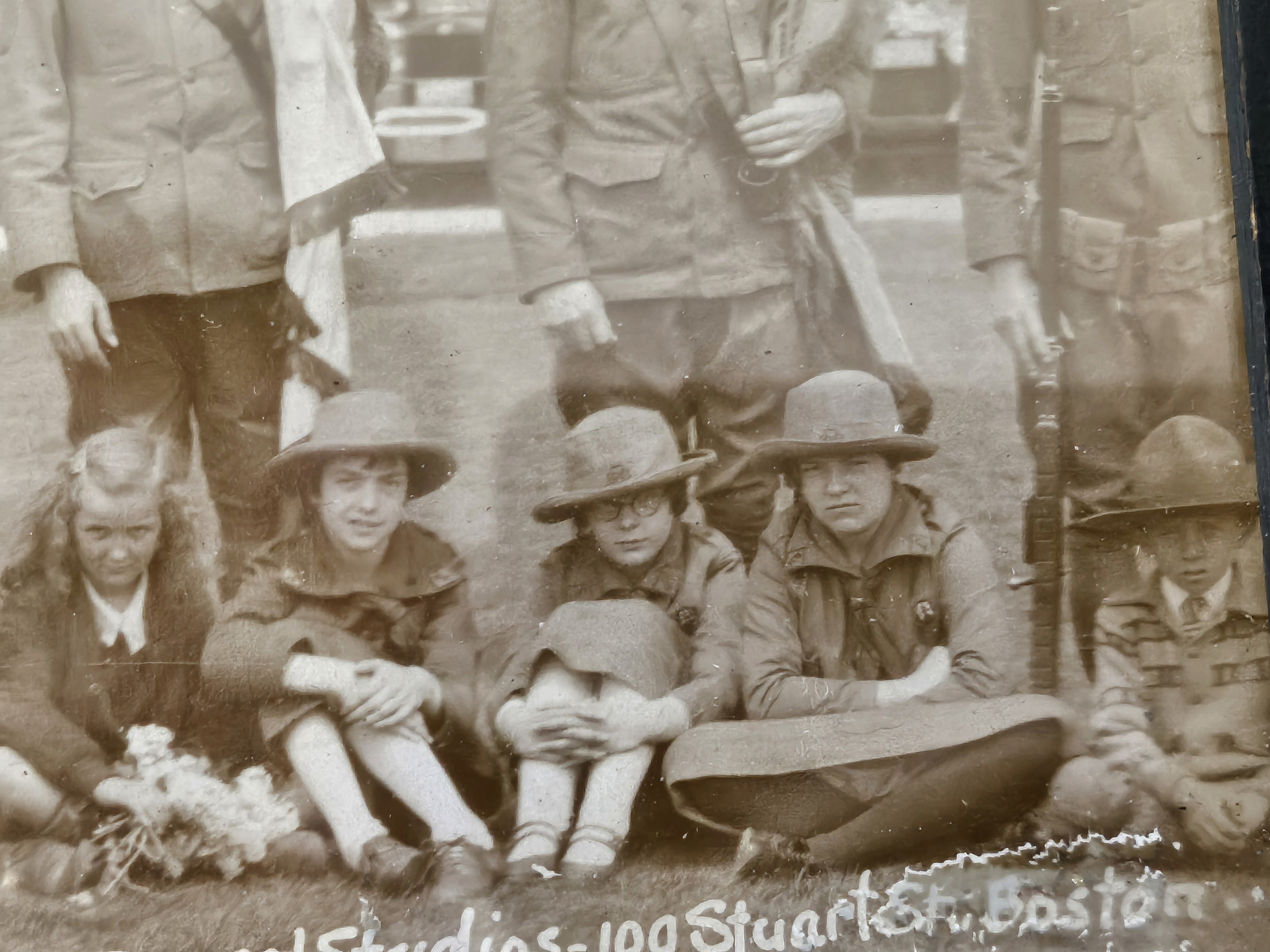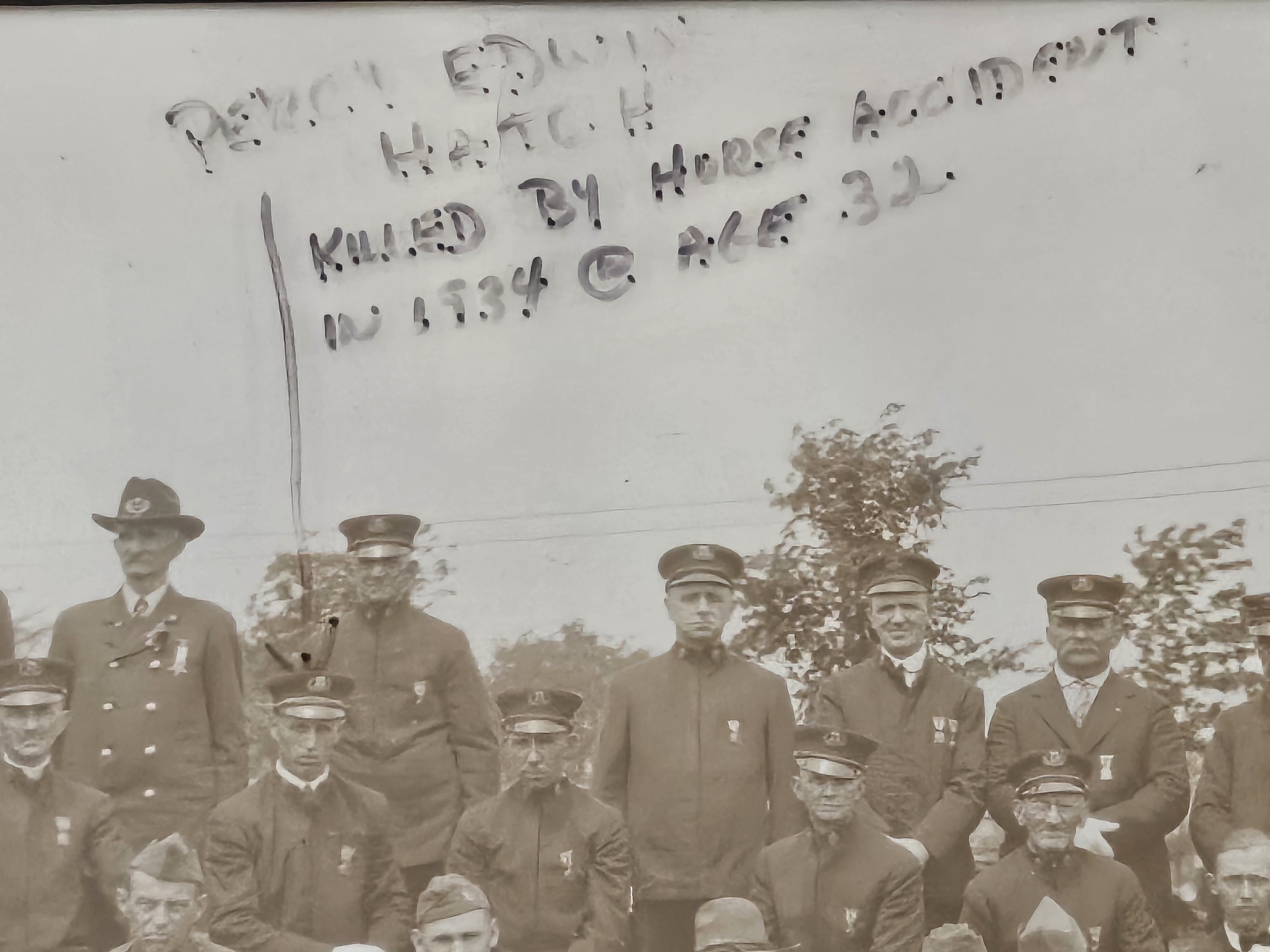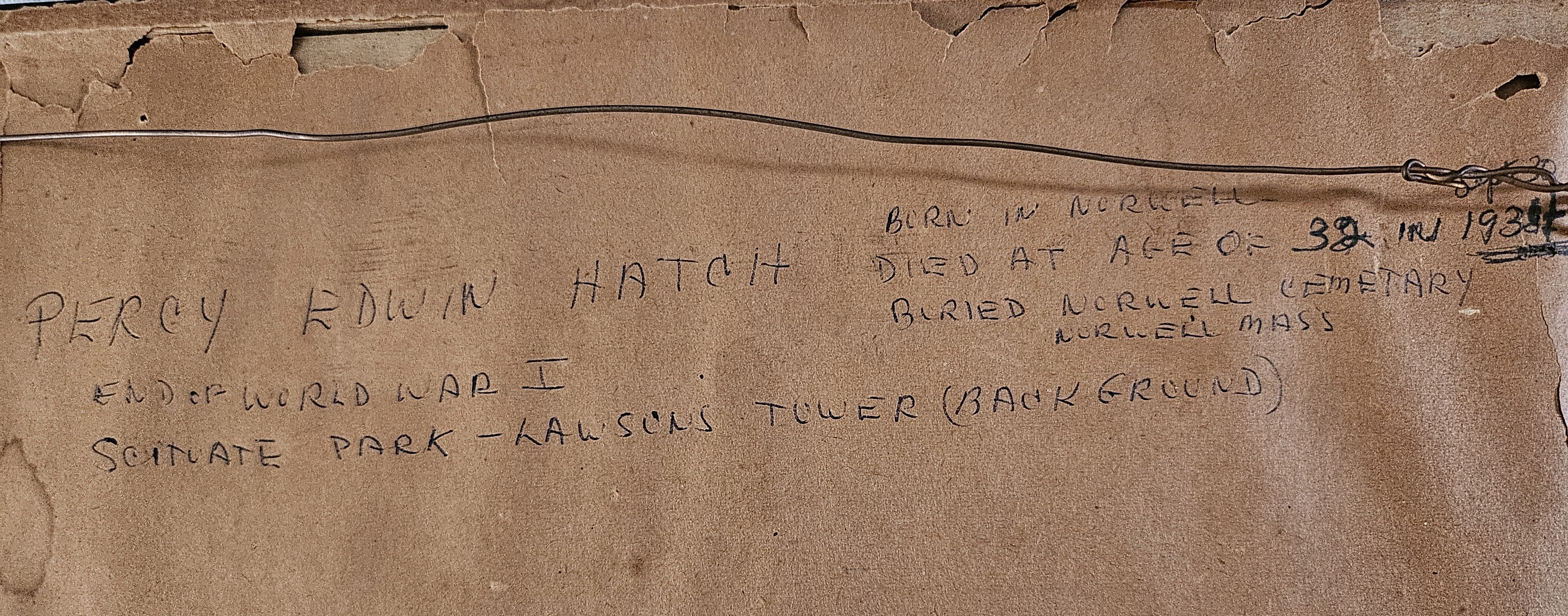 PERCY EDWIN HATCH IDENTIFIED WITH BLACK MARKER, KILLED BY HORSE ACCIDENT IN 1934. THIS INFO HAS BEEN INKED ON REVERSE AS WELL. PHOTO TAKEN AT THE SOLDIERS AND SAILORS MONUMENT. LAWSONS TOWER SEEN IN BACKGROUND. NOTICE THE GROUP OF GIRL SCOUTS ST BOTTOM RIGHT. ONE OF THE GIRLS IS BLACK. TERRIFIC PHOTO ESPECIALLY FOR ANYONE INTERESTED IN SCITUATE HISTORY.