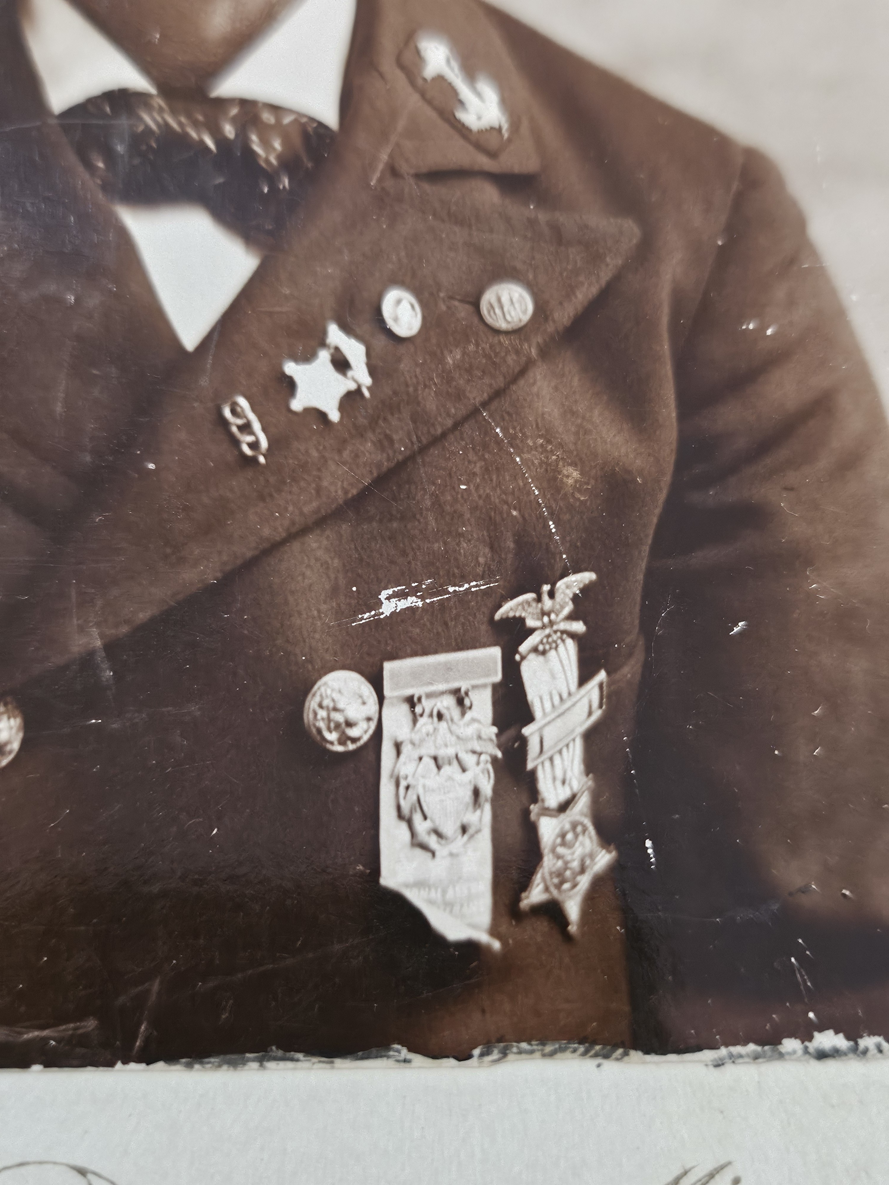 CABINET CARD PHOTO WITH MINNEAPOLIS PHOTOGRAPHER - NO ID - GREAT LOOKING PHOTO - HE US WEARING THE NAVAL NATIONAL ASSOCIATION BADGE ALONG WITH SEVERAL ITEMS. LOOKS LIKE HE IS WEARING A GAR LAPEL BADGE, SMALL GOLD GAR PIN AND A ODD FELLOWS PIN
