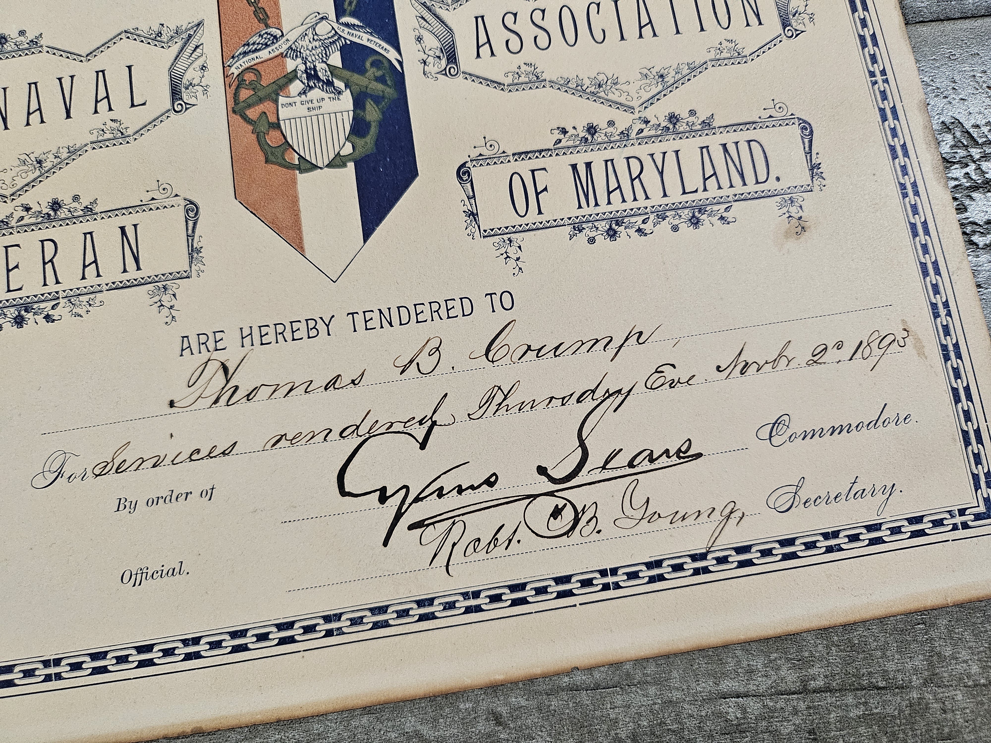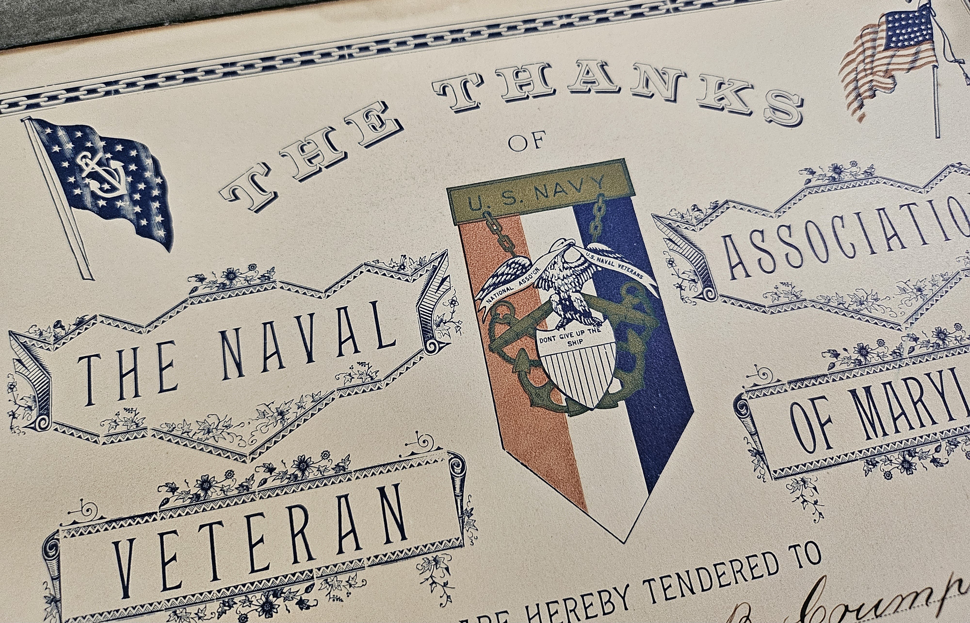 Scarce - THE NAVAL VETERAN ASSOCIATION OF MARYLAND CERTIFICATE