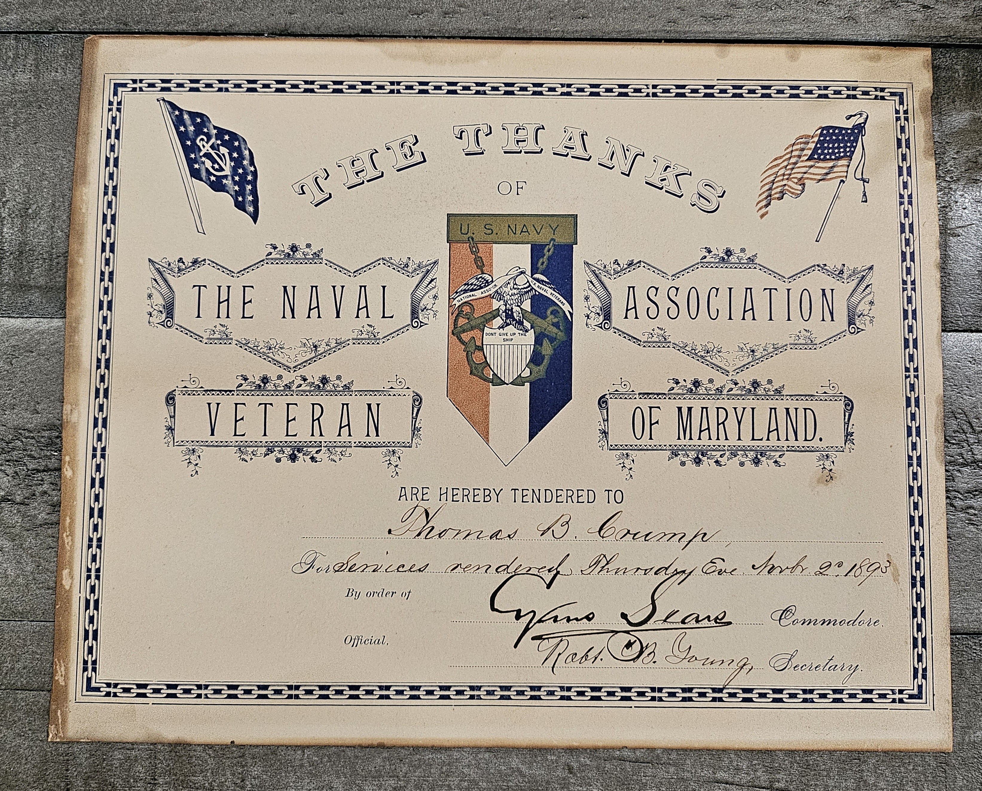 8 x 10.- PRESENTED TO THOMAS B. CRUMP IN 1893. SIGNED BY COMMODORE SEARS. VERY SCARCE NAVAL VETERANS ASSOC. CERTIFICATE