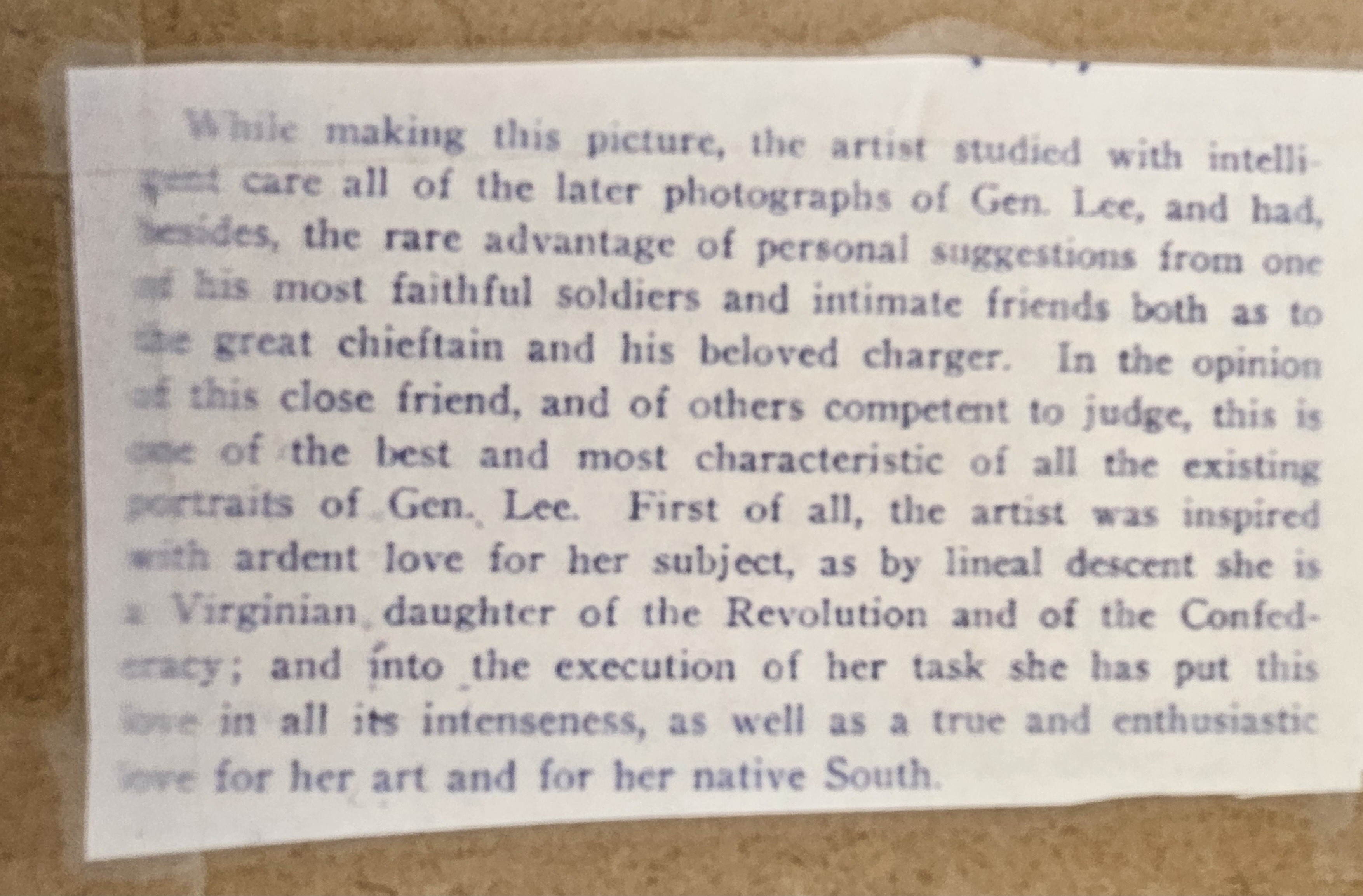 INFO ABOUT THE PAINTING IS SEEN ON BACK OF FRAME. INFO FROM THE CONFEDERATE VETERAN MAGAZINE, FEBRUARY, 1905.