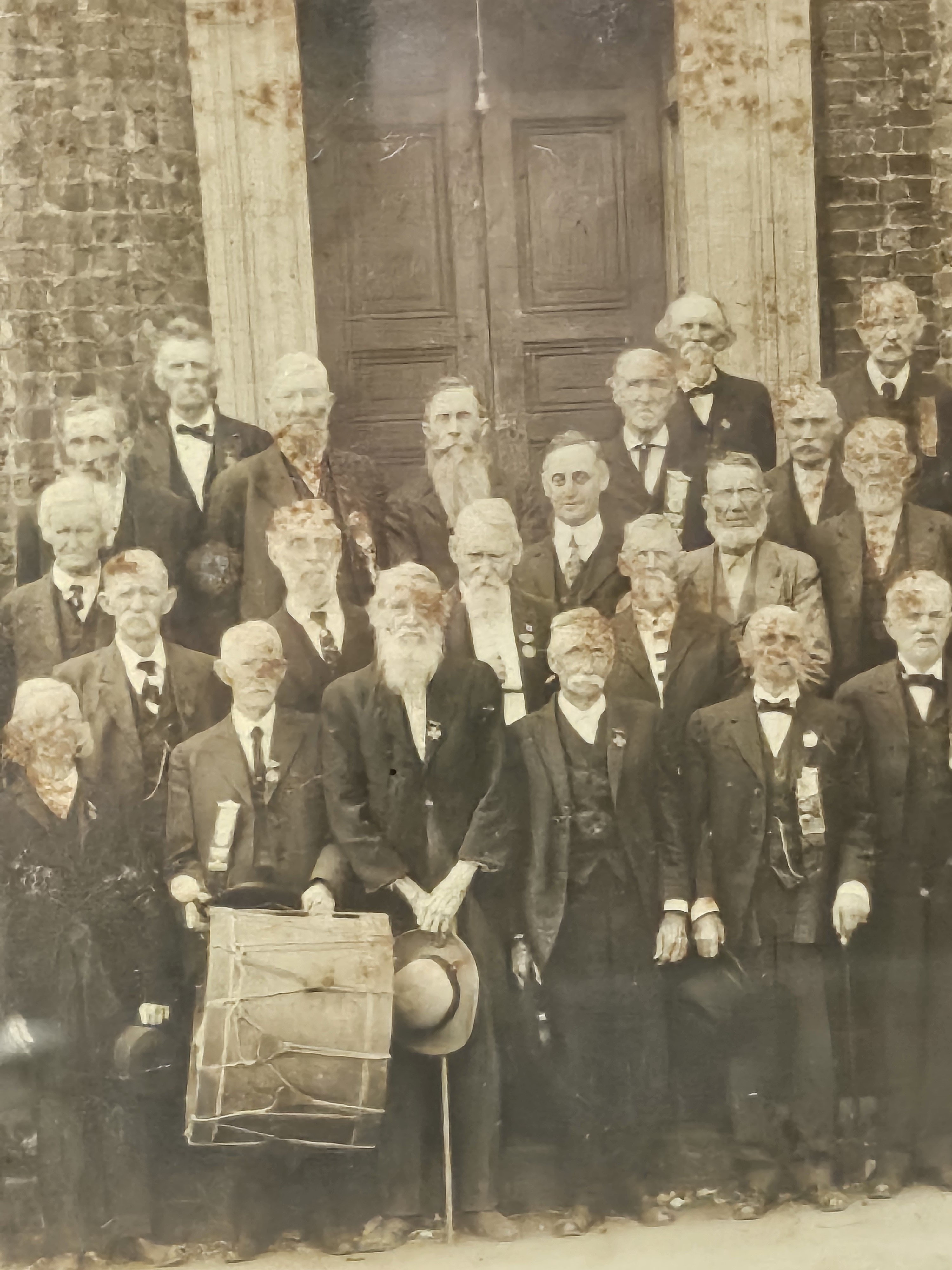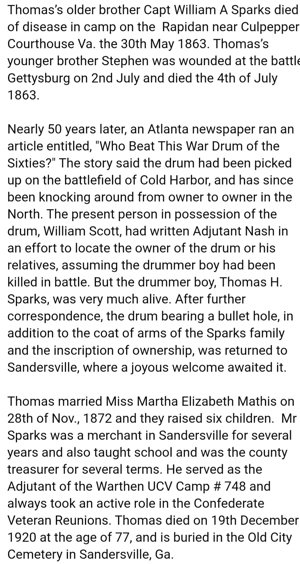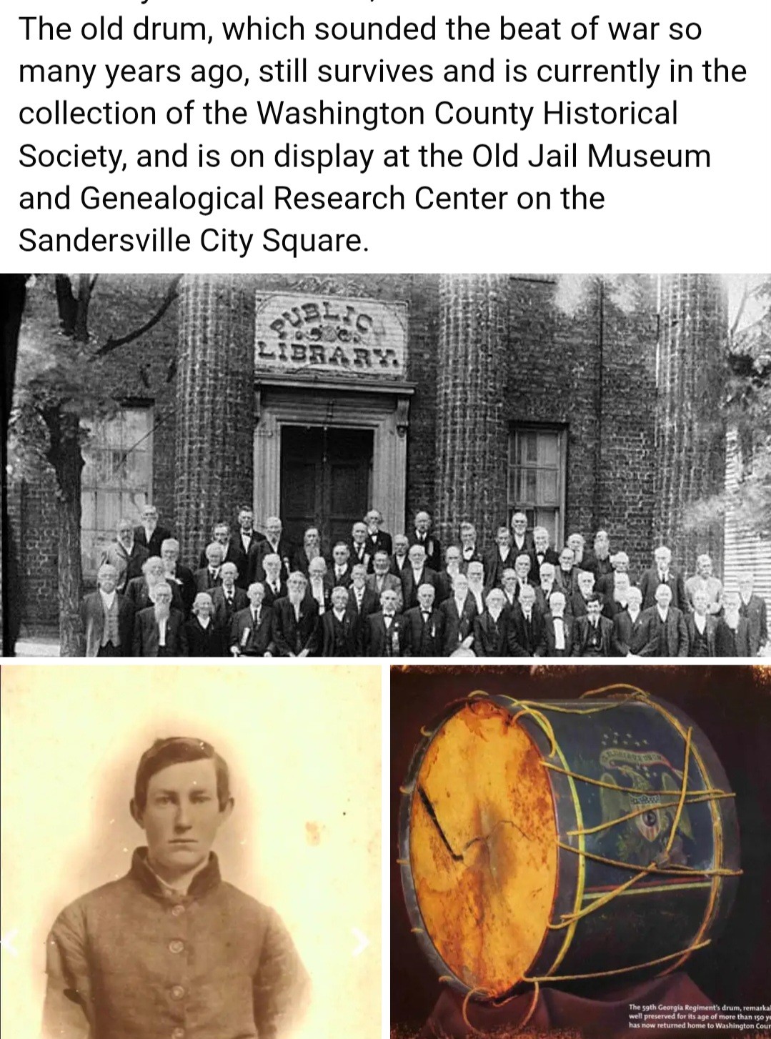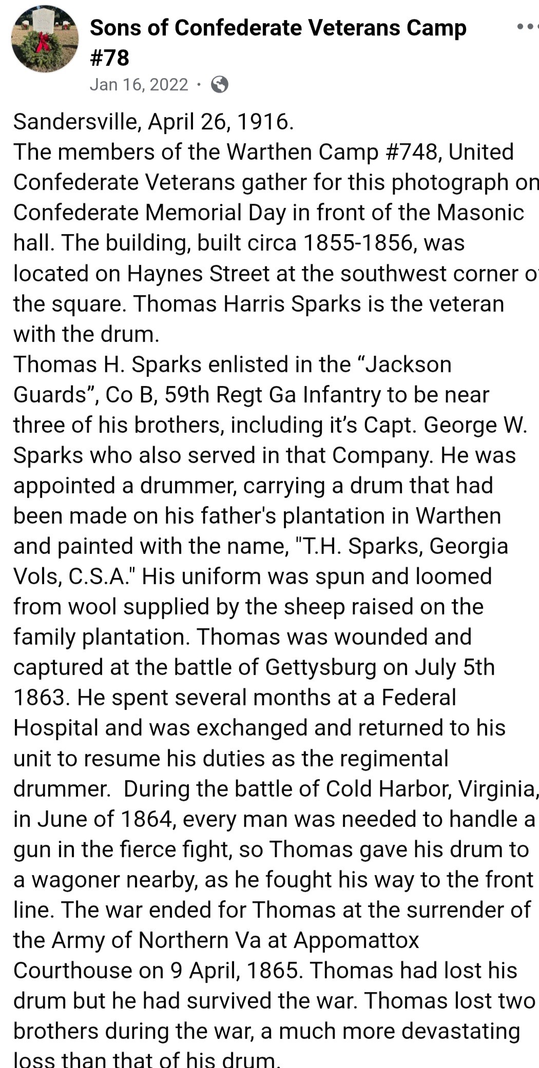 Authentic photo of Confederate Veterans in front of the Masonic Hall in Sandersville, Georgia. I found a nice write up on Harris Sparks who is holding the drum. He served in CO. B, 59th GA Volunteer Infantry. See attached info in pictures above for all the details. His drum is in the local museum.