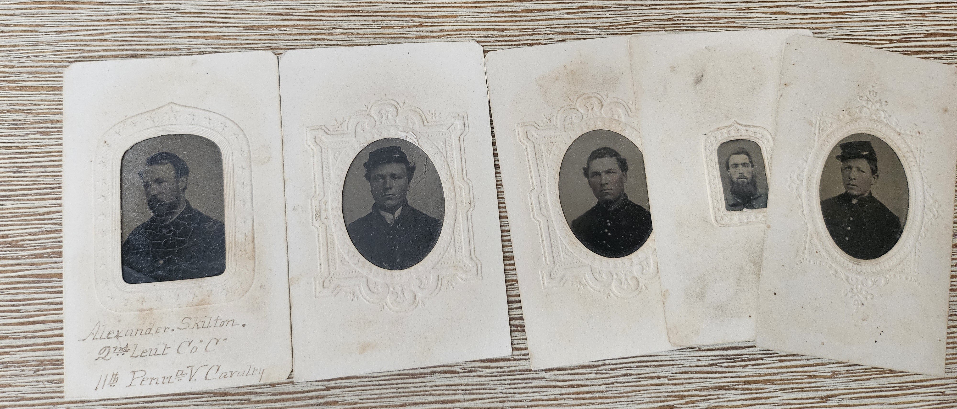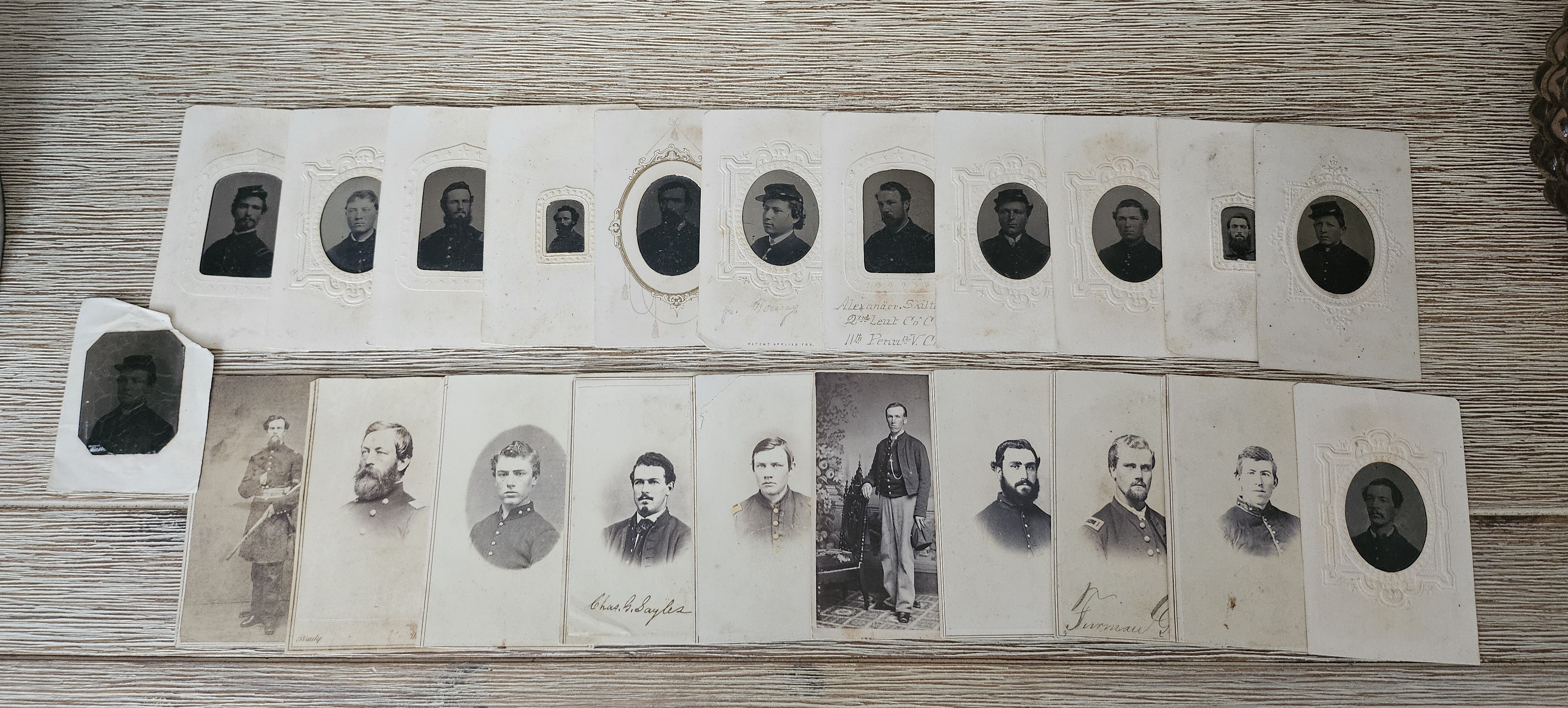 22 VIEWS ~ 9 CDV'S AND 13 TINTYPES OF THE 11TH PENNSYLVANIA CAVALRY ~ 15 ARE IDENTIFIED - THE 11 PA CAVALRY LITHO PICTURED AS THE BACKDROP IS NOT AVAILABLE