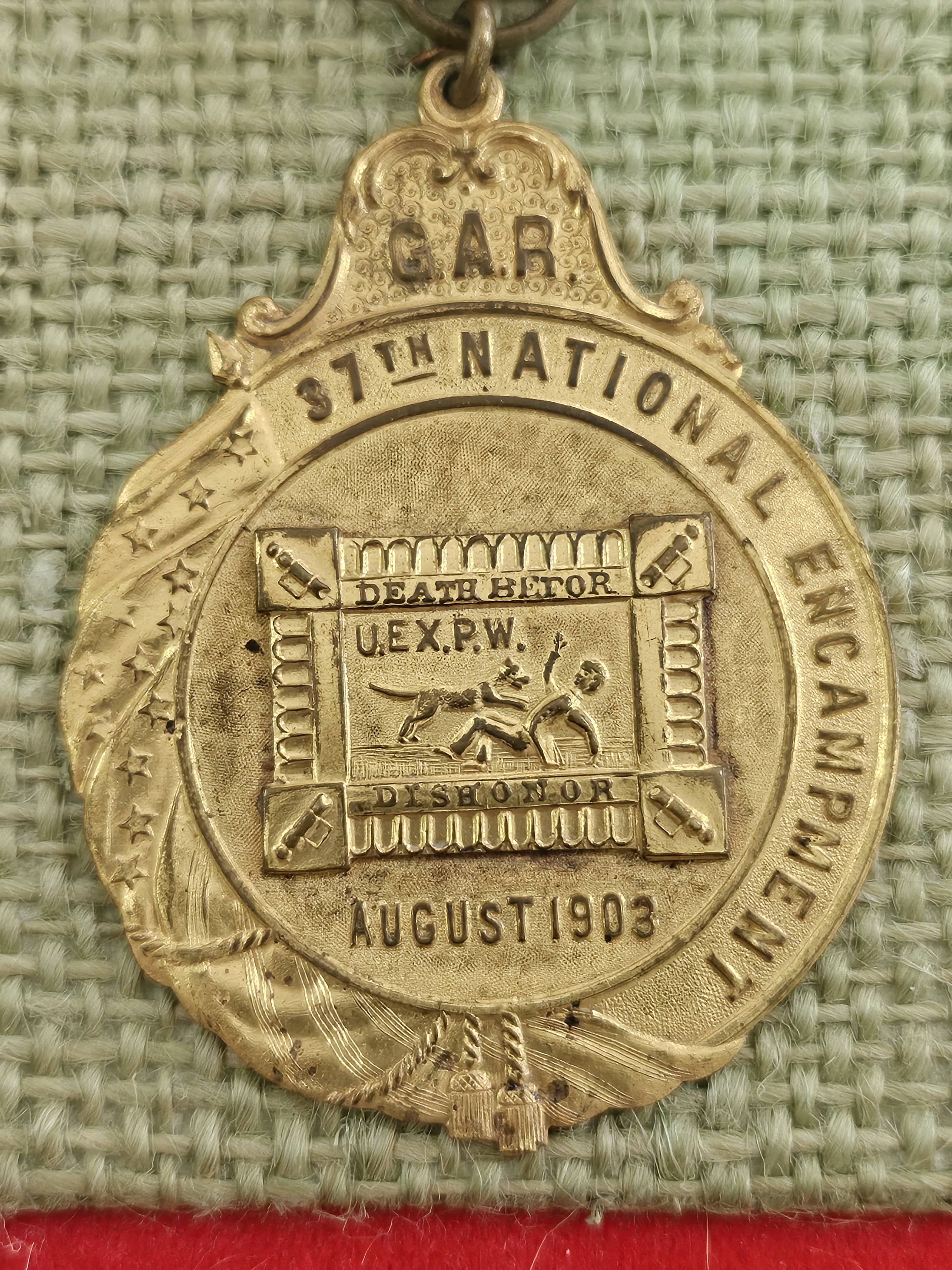 NICE POW BADGE FROM THE 1903 NATIONAL ENCAMPMENT OF THE GRAND ARMY OF THE REPUBLIC - BADGE IS MOUNTED ON A STIFF BOARD COVERED IN FABRIC - I HAVE NOT TRIED TO REMOVE IT - PROBABLY BEST TO LEAVE IT AS IS