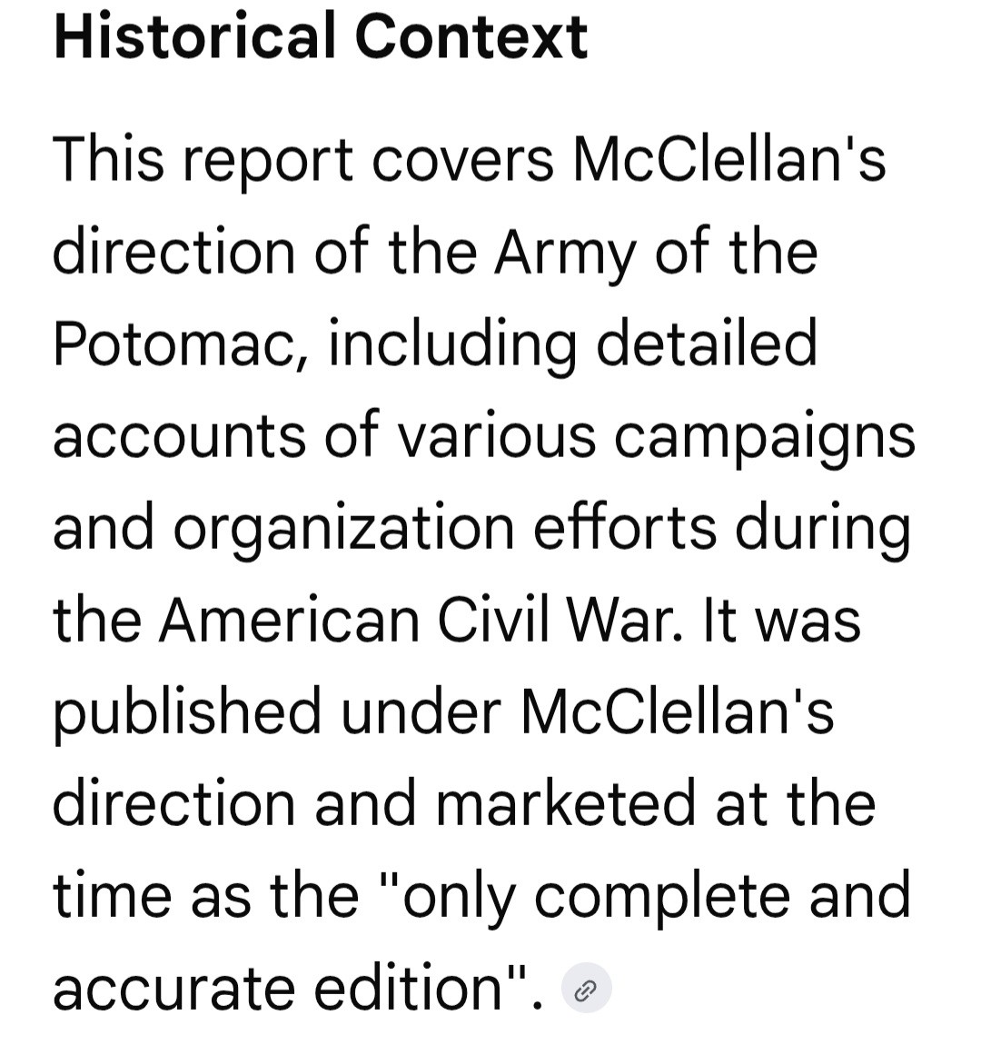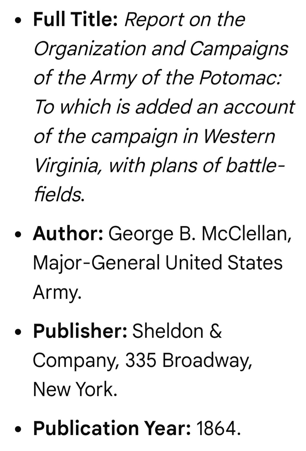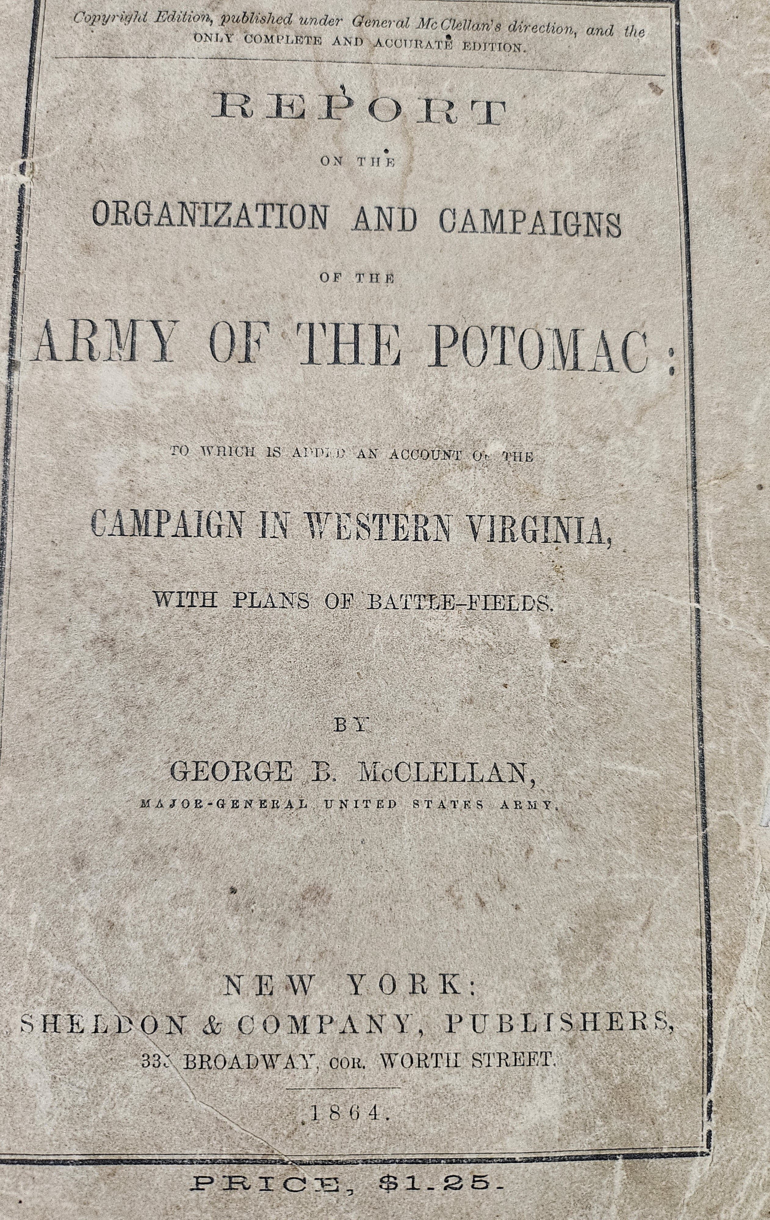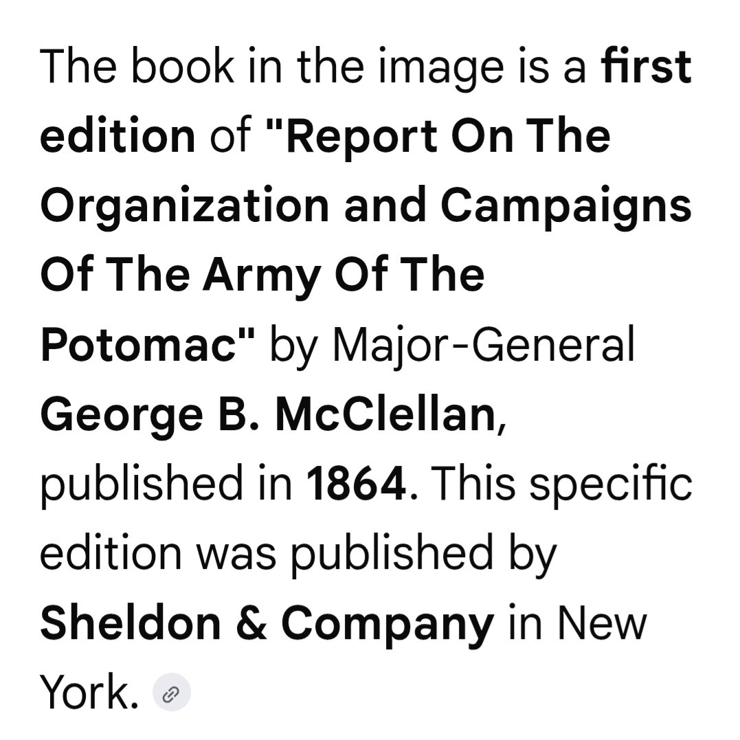 1864 - ORGANIZATION & REPORT ARMY OF THE POTOMAC - GEORGE McCLELLAN