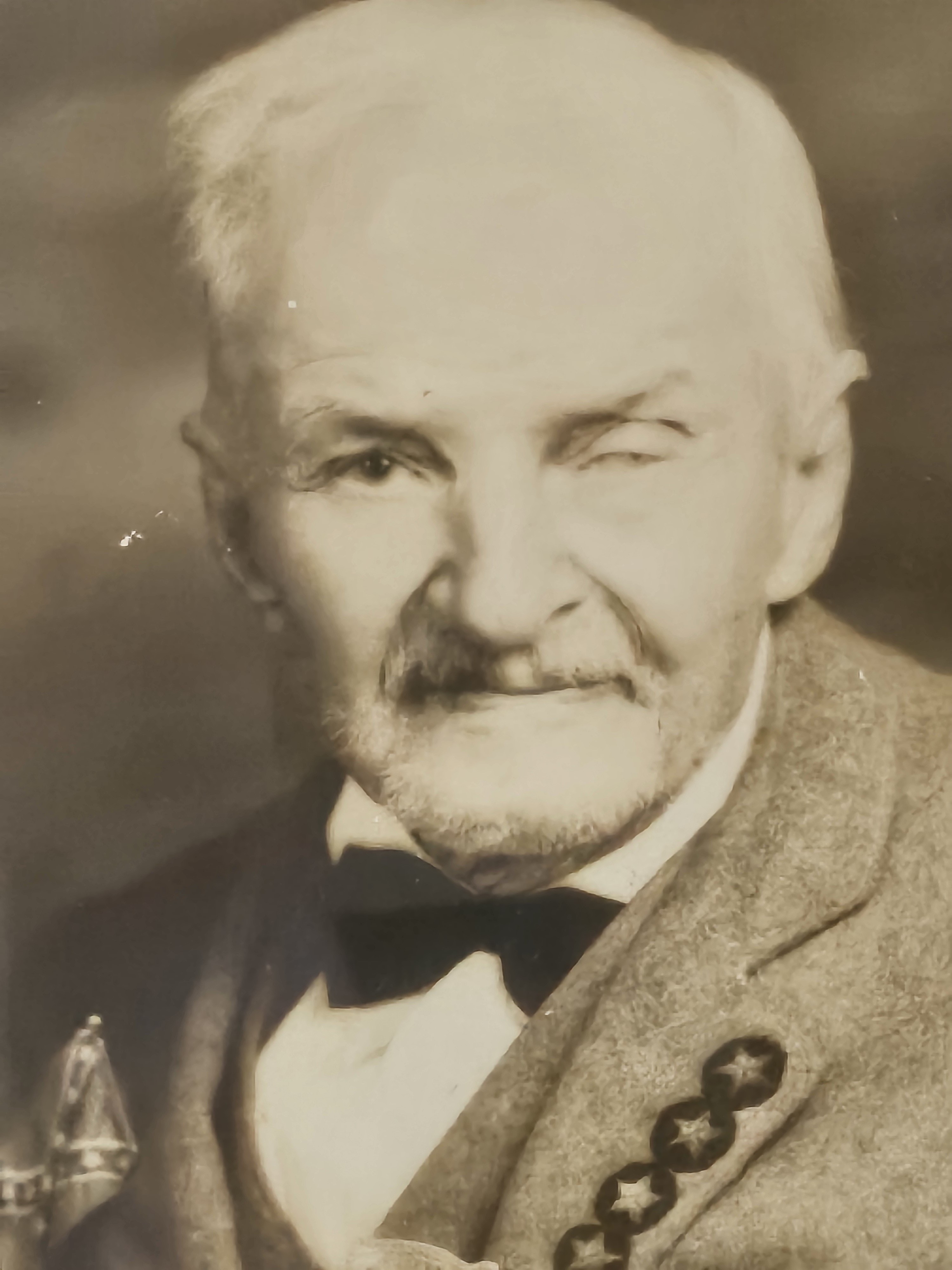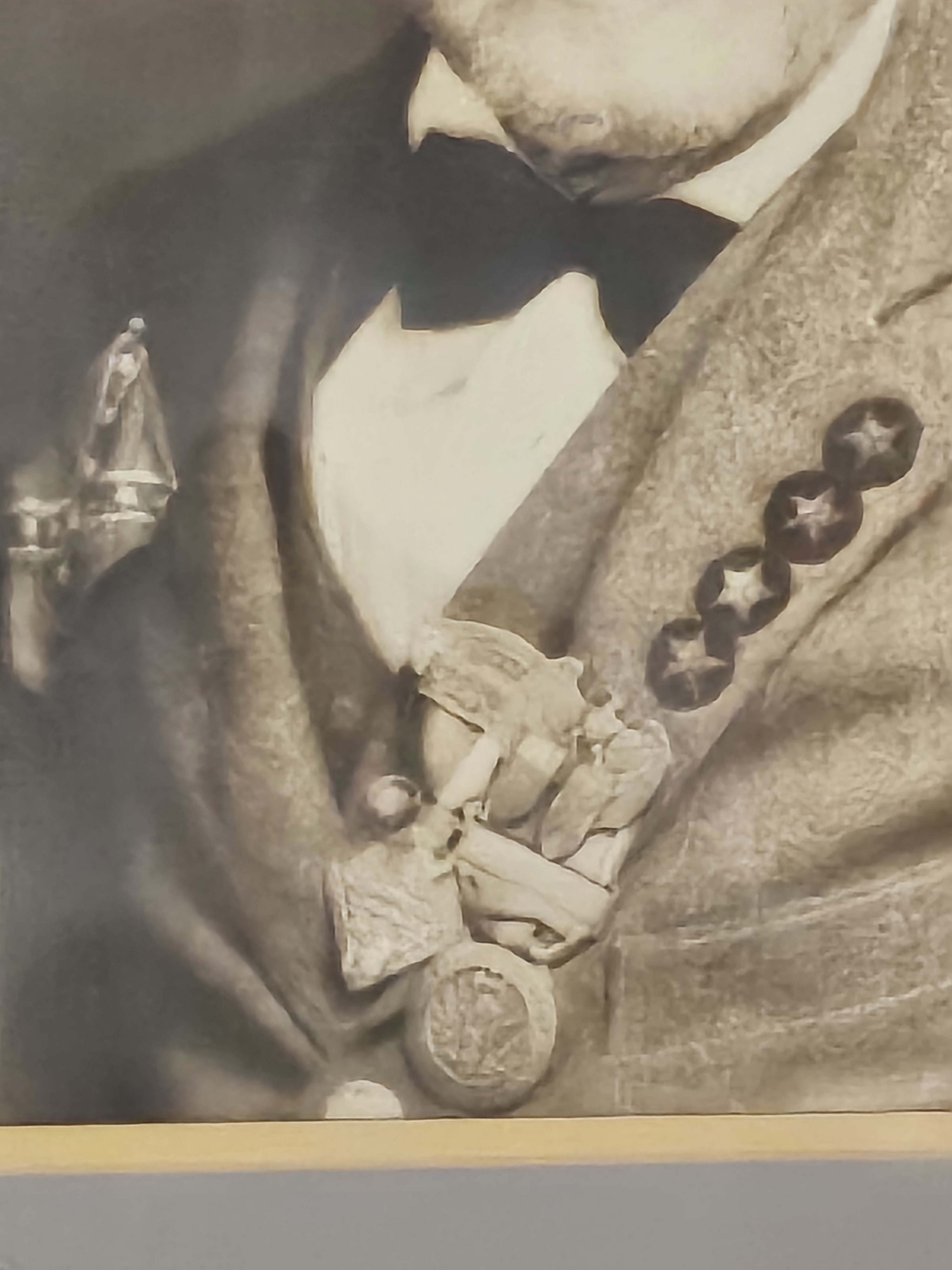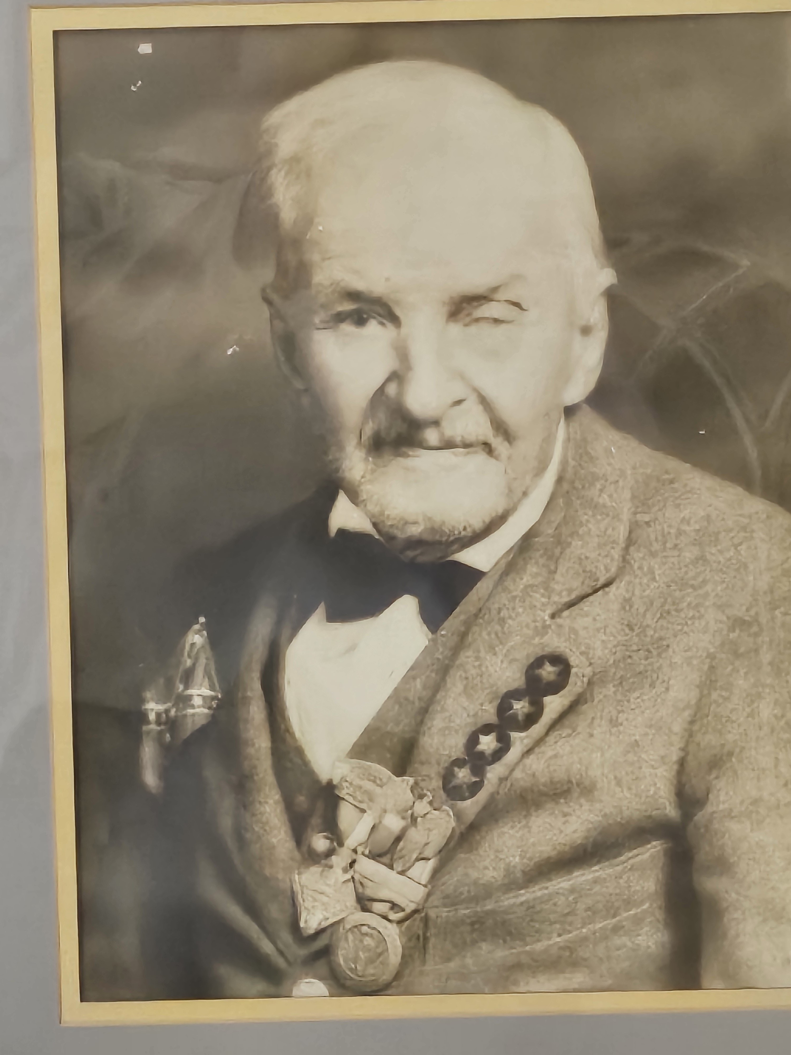 LARGE IMPRESSIVE PHOTO OF CAPT. JOHN ANDREW JACKSON DOWDY. HE HAD AN IMPRESSIVE HISTORY WITH MORGAN'S RAIDERS. SEE STORY ABOUT HIS REVENGE POSTED ABOVE IN THE PICS. HE PROUDLY WEARS HIS 1938 GETTYSBURG AND 1938 COLUMBIA, SOUTH CAROLINA BADGES ON HIS COAT. HE ATTENDED THE 1938 GETTYSBURG REUNION (photos above).