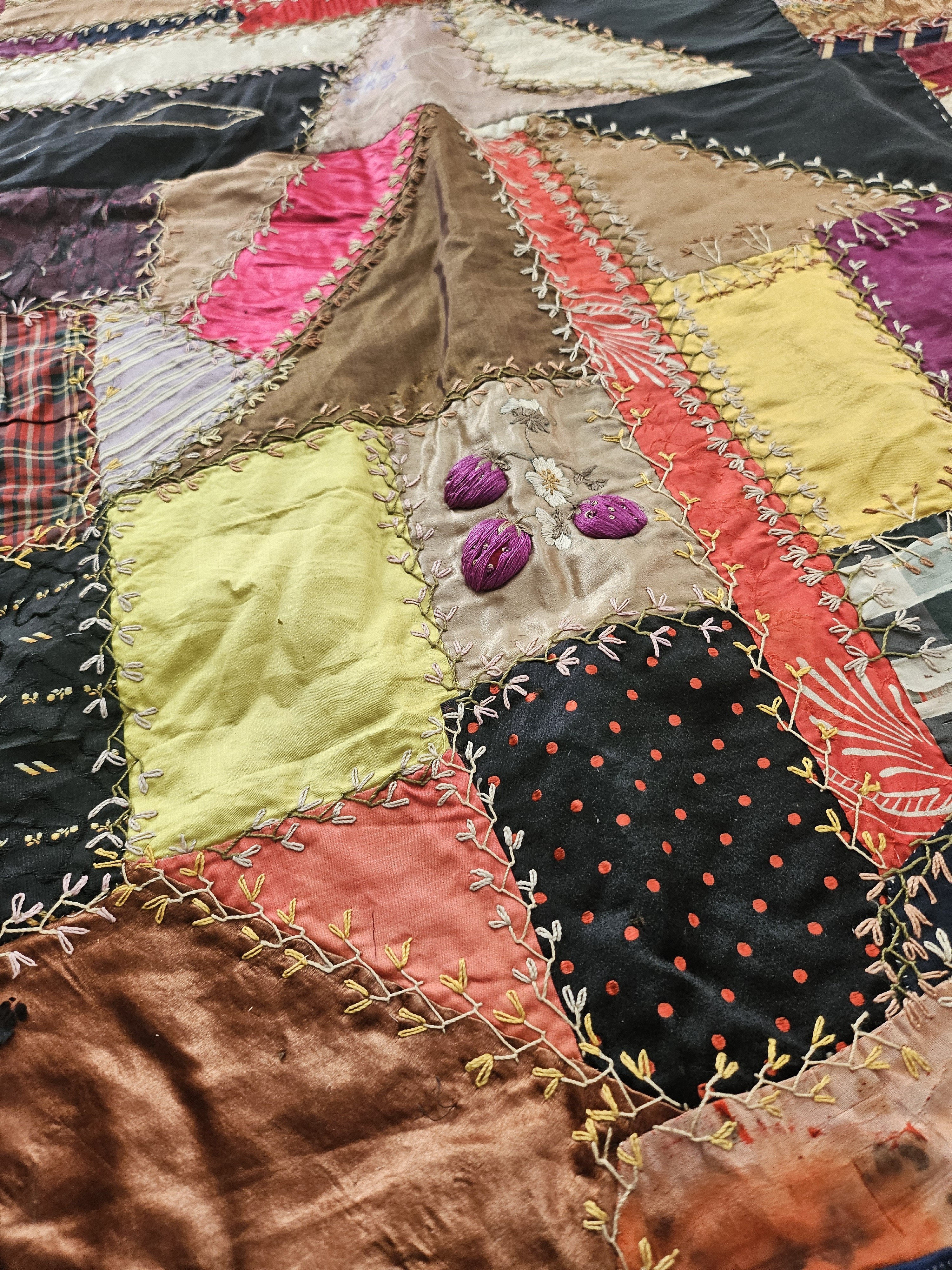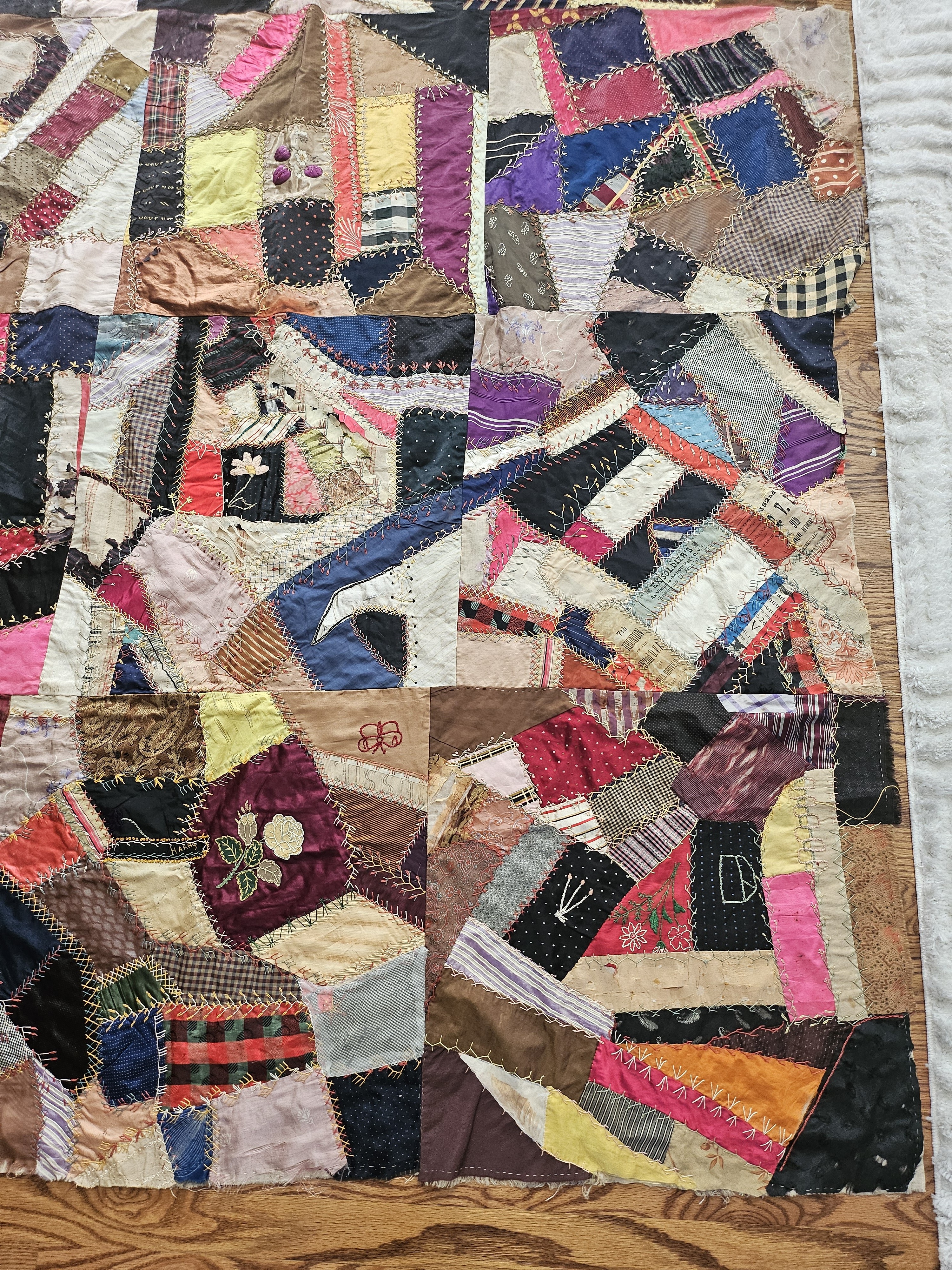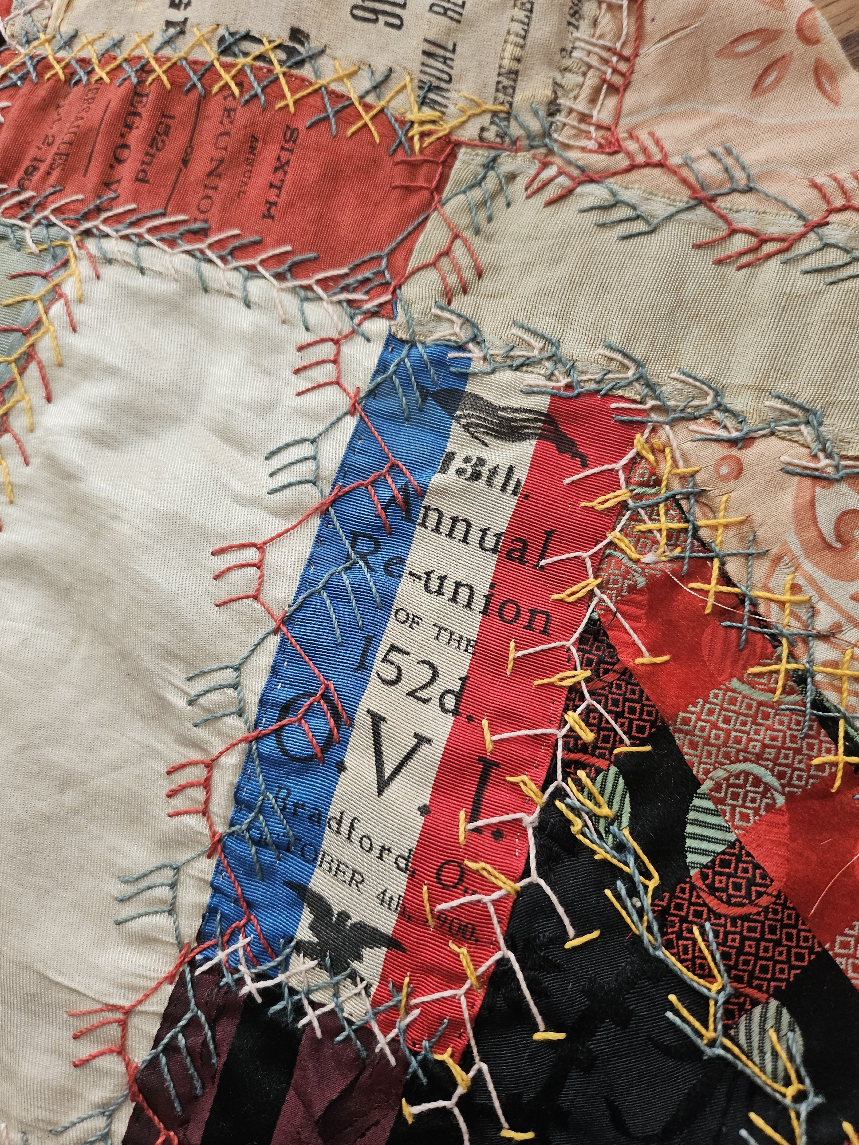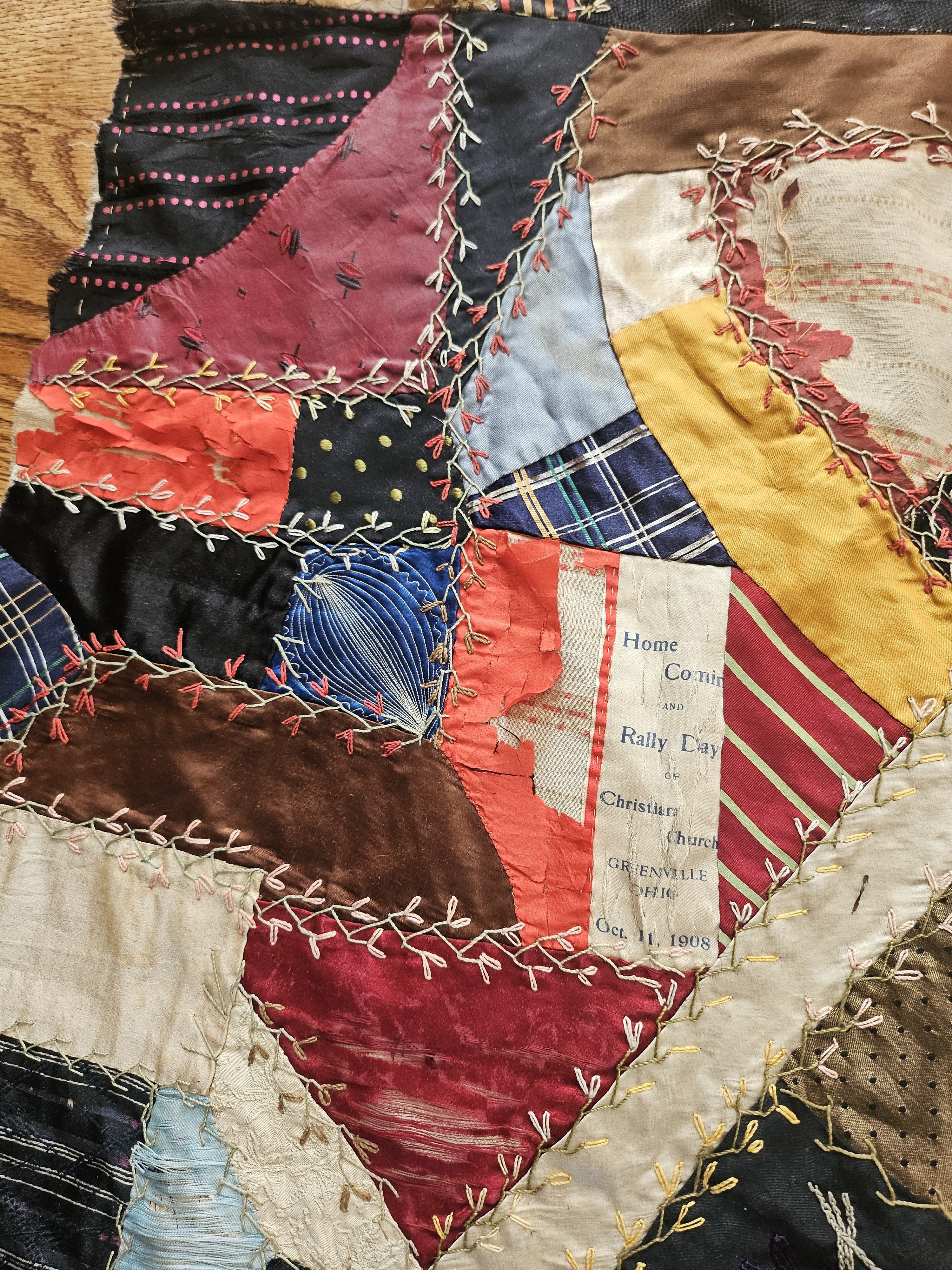 Crazy quilt with 6 ribbons sewn on a couple of different panel's. The first ribbon is 1908 Greenville- Homecoming and Rally Day Christian Church. The other 5 are Ohio regimental reunion ribbons.