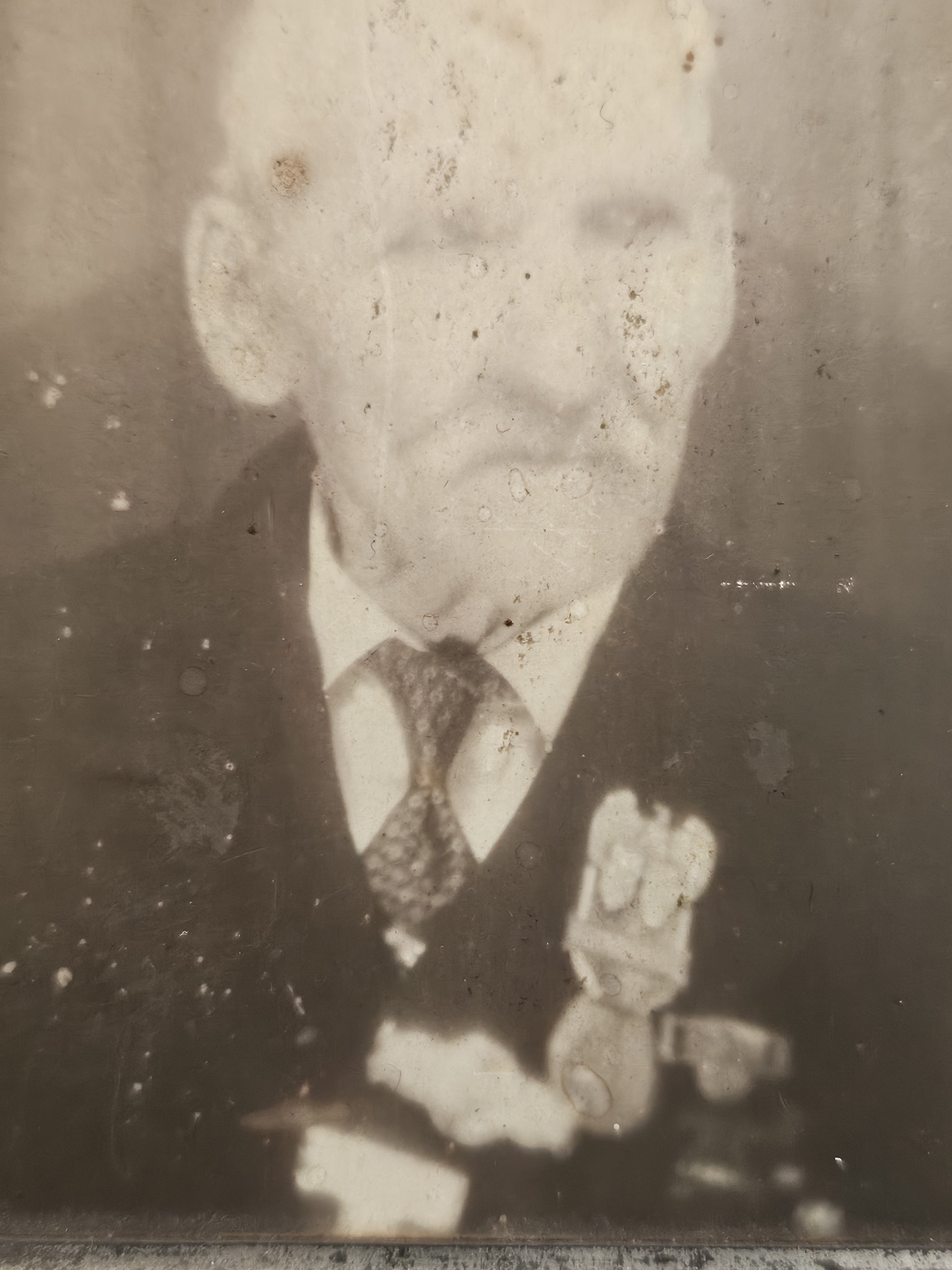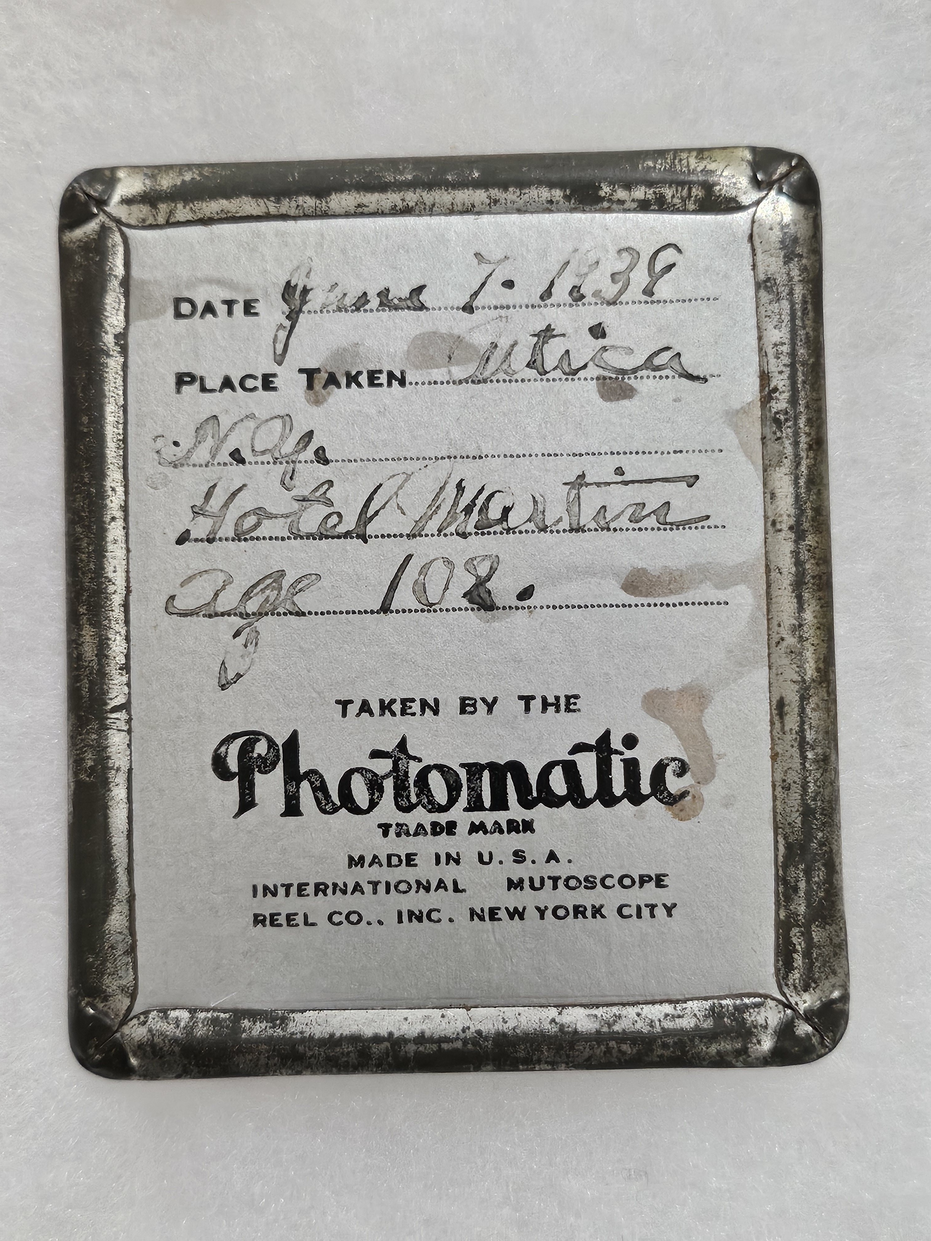 Photo of a Union Veteran wearing his 1938 Gettysburg badge. Reverse states he was 108 years old. Measures 2.5 x 3